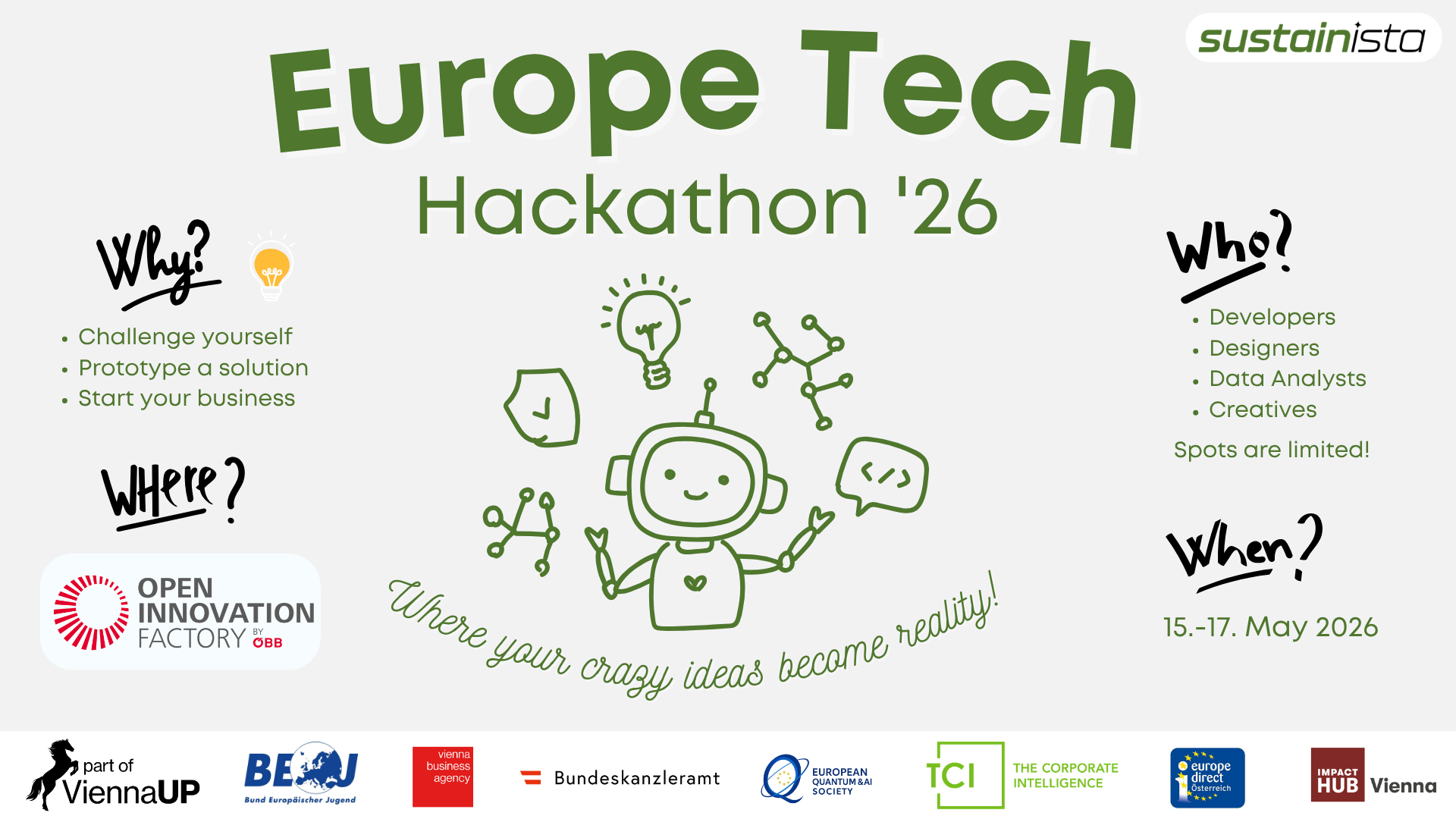 From May 15 to 17, 2026, the Europe Tech Hackathon 2026 welcomes designers, innovators, and tech enthusiasts to the ÖBB Open Innovation Factory in Vienna. As a proud part of ViennaUP, Europe’s most dynamic startup festival, and hosted by Sustainista, this event challenges you to redefine the potential of AI agents. Together, we’ll tackle pressing challenges in sustainability, shaping solutions that create real-world impact. No matter your background, this is your chance to innovate, collaborate, and make a difference. Take part and be part of the transformation! GET YOUR TICKETS HERE!